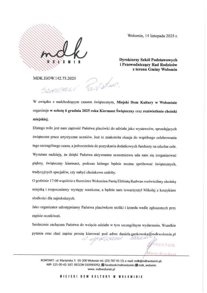Zapraszamy uczniów oraz rodziców do udziału w Kiermaszu Świątecznym połączonym z rozświetleniem choinki miejskiej, który odbędzie się w sobotę 6 grudnia 2025 roku na Placu 3 Maja w Wołominie.