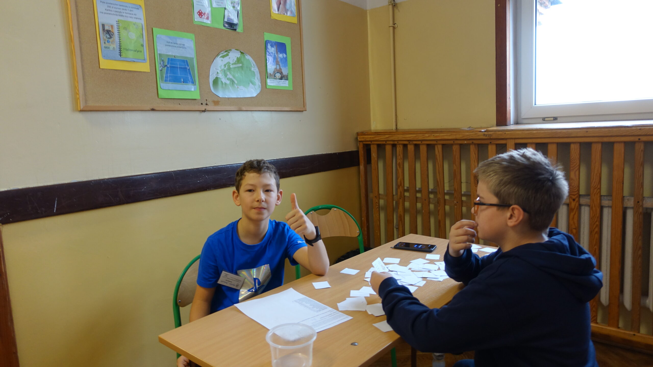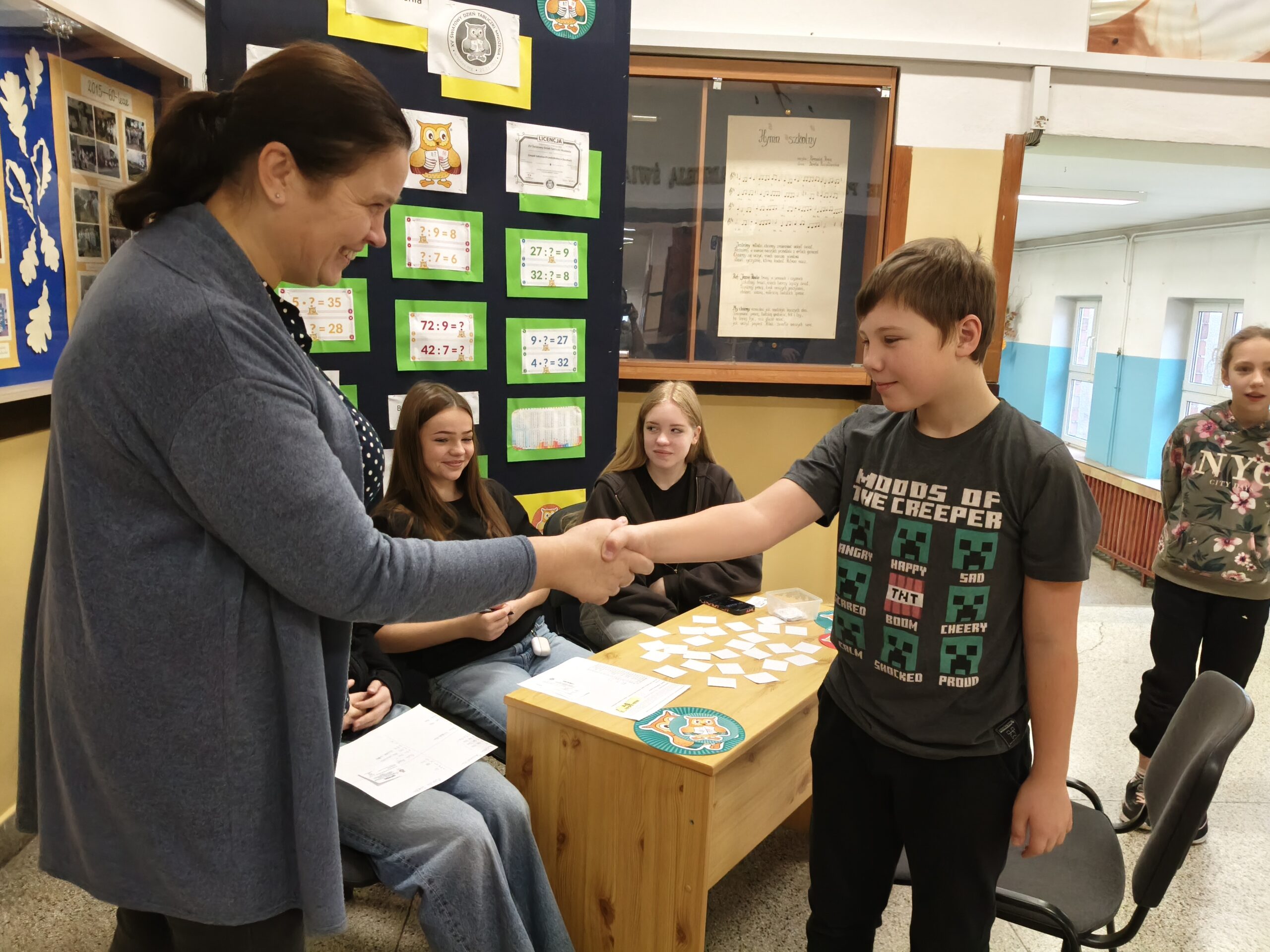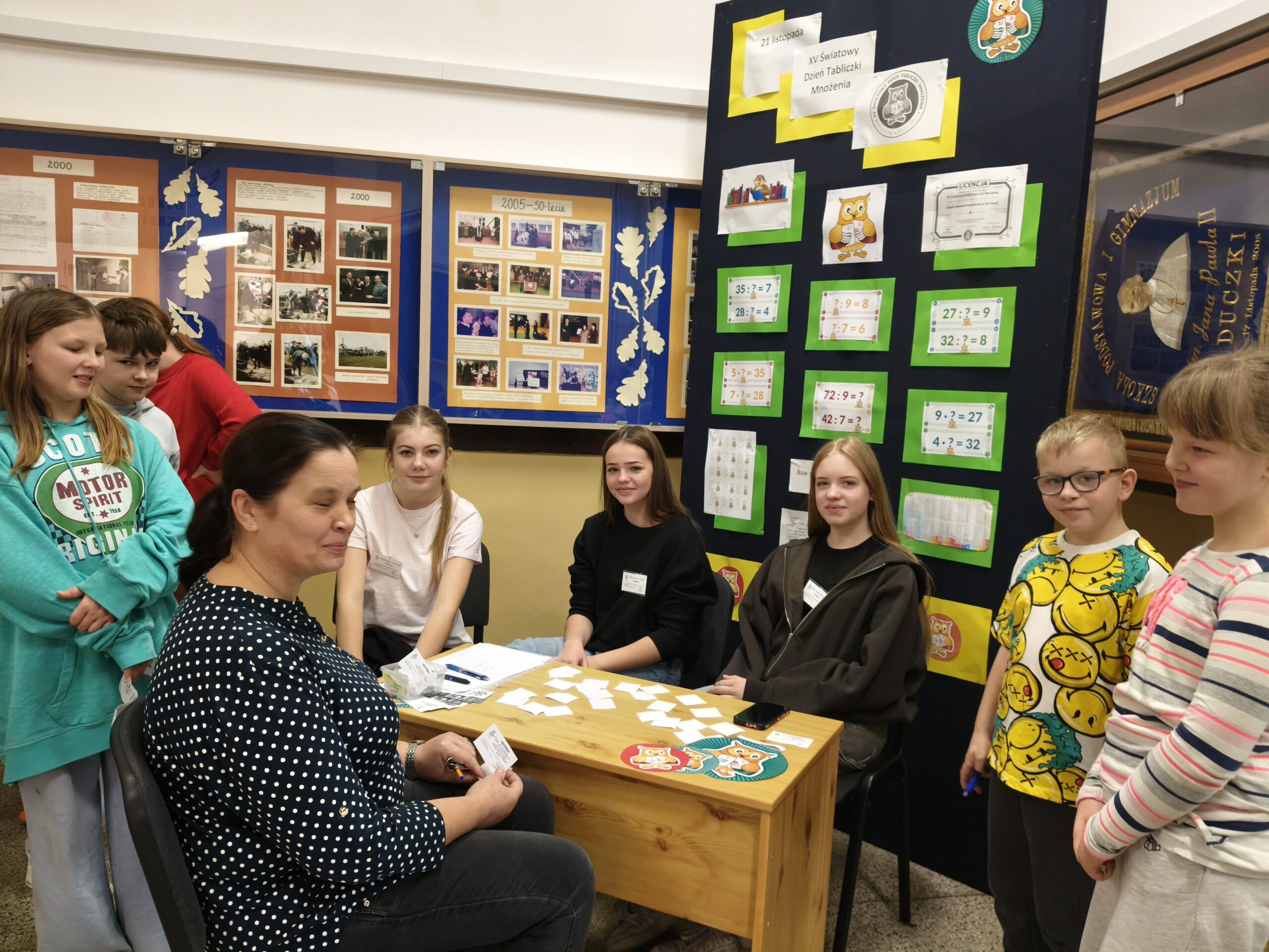 Uczniowie SP klas 3-8 na lekcjach matematyki zdawali egzamin z tabliczki mnożenia. Egzaminatorami byli uczniowie z klas 8c: Aleksandra Tlaga, Julia Kukowska, Magdalena Suchocka, z 8a: Alicja Wóltańska, Weronika Wnuk i Maja Nowińska z 6c: Wojciech Jędrasik i Kostyantyn Sopets. Każdy uczestnik losowo otrzymał kartę z pięcioma działaniami, które musiał rozwiązać w czasie dwóch minut. Za bezbłędne odpowiedzi uczniowie otrzymywali certyfikaty mistrza tabliczki mnożenia i brawa od klasy. Lekcje matematyki przyniosły wiele emocji i wzruszeń. Do egzaminu przystąpiło 296 uczniów, certyfikat otrzymało 179 co stanowi 60% zdawalności. Najlepszą klasą która doskonale sobie poradziła z mnożeniem i dzieleniem w zakresie 100 była klasa 8c – 100%, II miejsce zdobyła klasa 3a – 96% . III miejsce uzyskała klasa 8b – 82% . Najlepszy czas z egzaminu miała Aleksandra Tlaga z klasy 8c – 4,17 sekundy. Znajomość tabliczki mnożenia młodsi sprawdzali również u dorosłych. Oczywiście mimo stresu wszyscy zdający pracownicy szkoły otrzymali certyfikat.