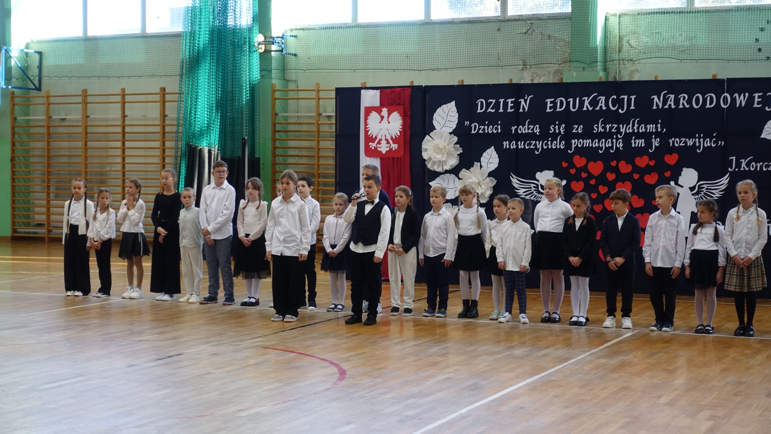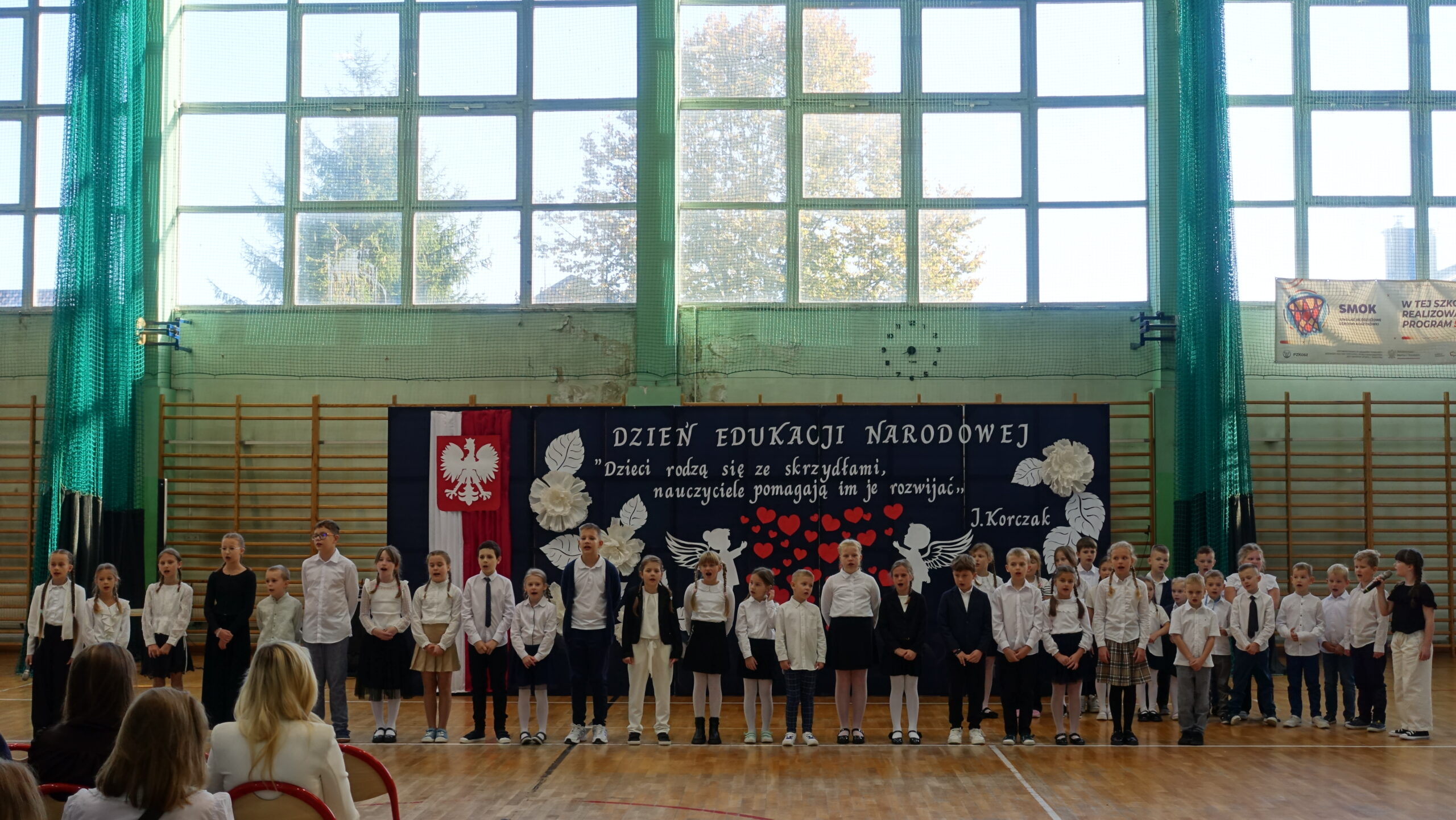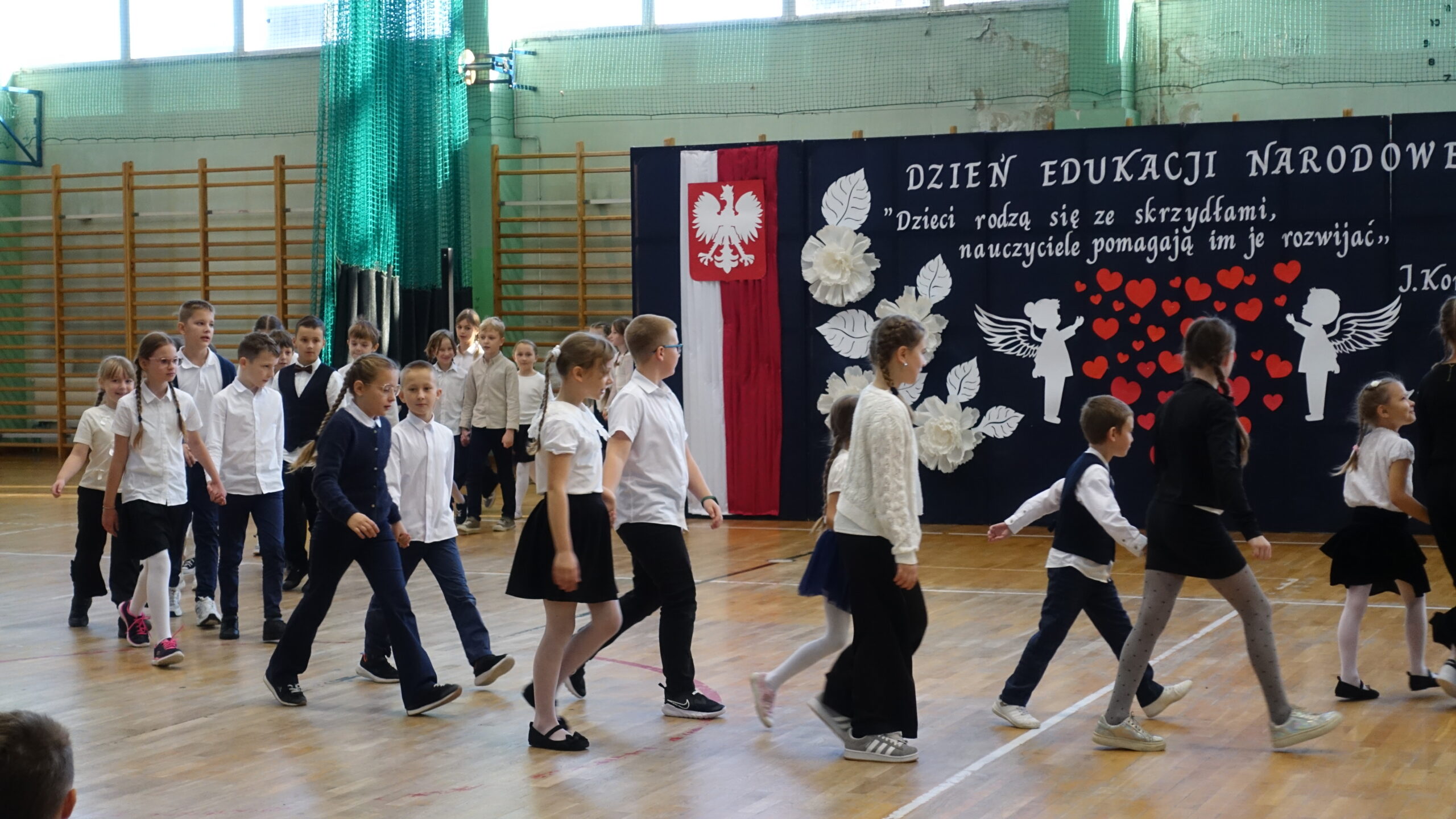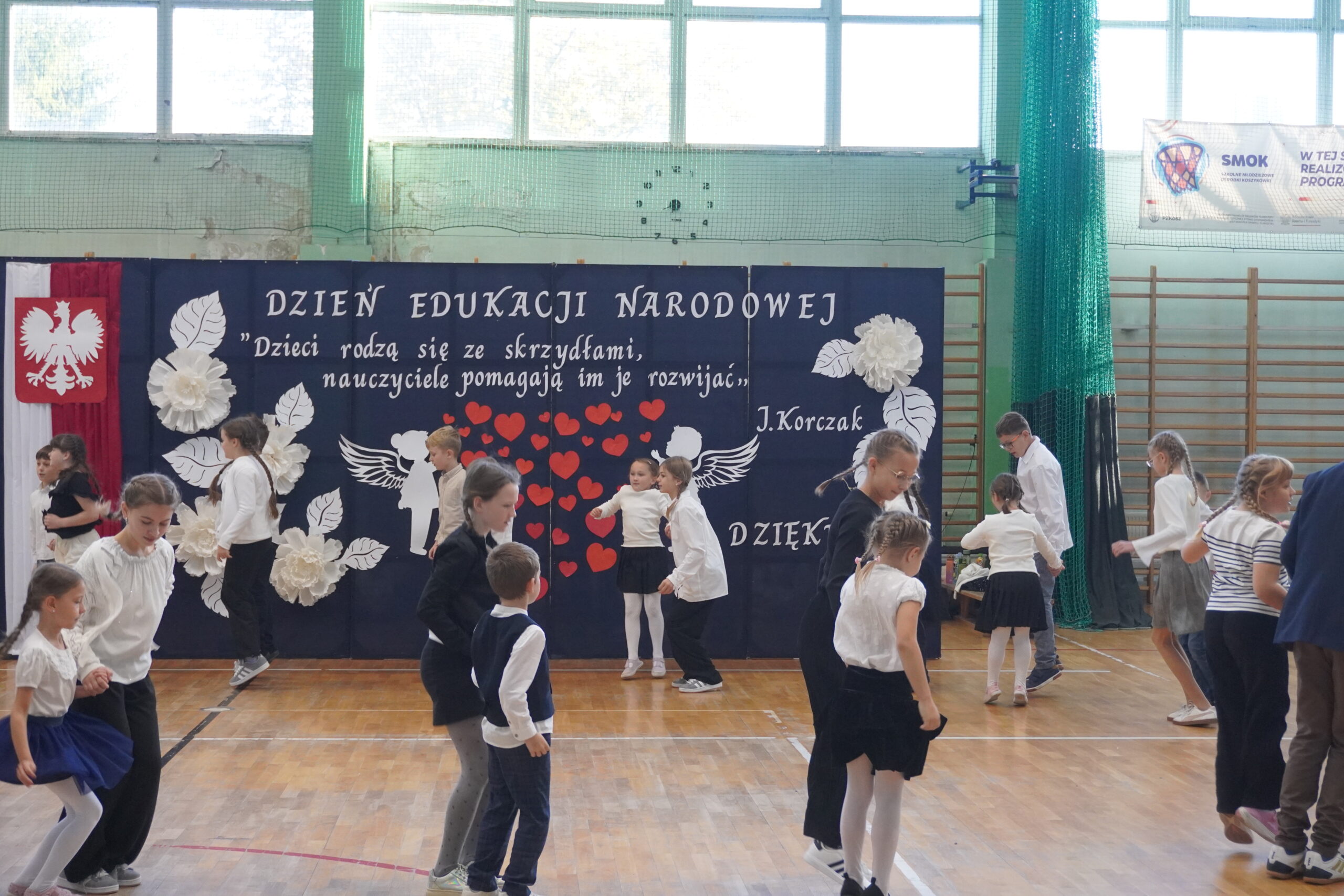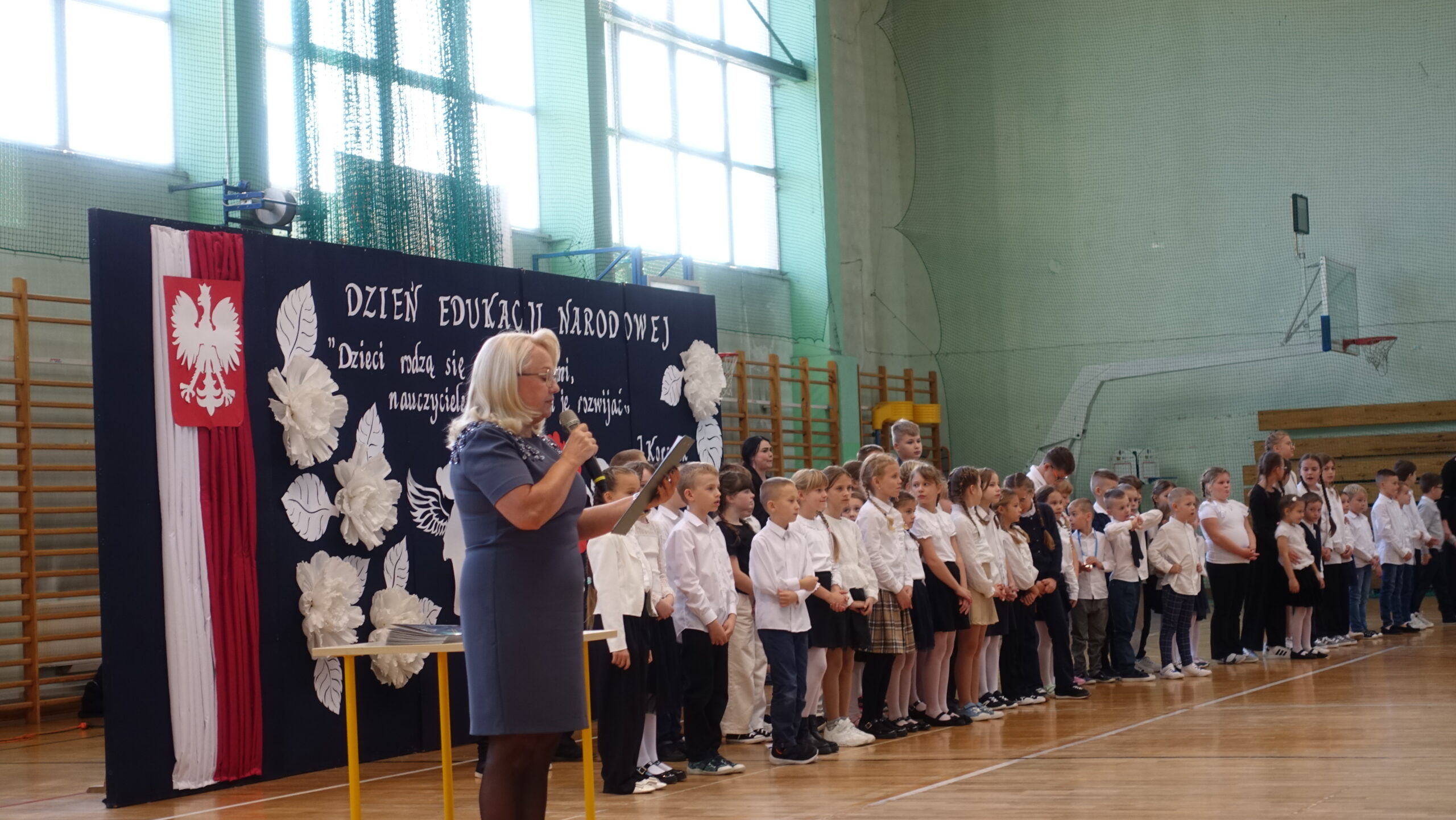 14 października 2025 roku w naszej szkole odbyły się obchody Dnia Edukacji Narodowej. Uroczystość rozpoczęła się od przemówienia pani dyrektor Małgorzaty Wyszyńskiej, w którym podkreśliła rolę nauczyciela w kształtowaniu młodych pokoleń oraz podziękowała za codzienny trud wszystkim pracownikom szkoły. Uczniowie pod kierunkiem wychowawców klas 1b, 2c, 3a i 5b przygotowali wyjątkowy montaż słowno-muzyczny. Podczas uroczystości zatańczyli belgijkę a następnie poprosili do tańca dyrekcję szkoły oraz nauczycieli. Układ taneczny został entuzjastycznie przyjęty przez publiczność. Uczniowie z Samorządu Uczniowskiego wręczyli symboliczne upominki pracownikom szkoły. Ważnym punktem uroczystości było wręczenie nagród dyrektora dla wyróżniających się nauczycieli oraz pracowników szkoły, w uznaniu za ich zaangażowanie i osiągnięcia. Uroczystość zakończyła się degustacją tortu ufundowanego przez Radę Rodziców.