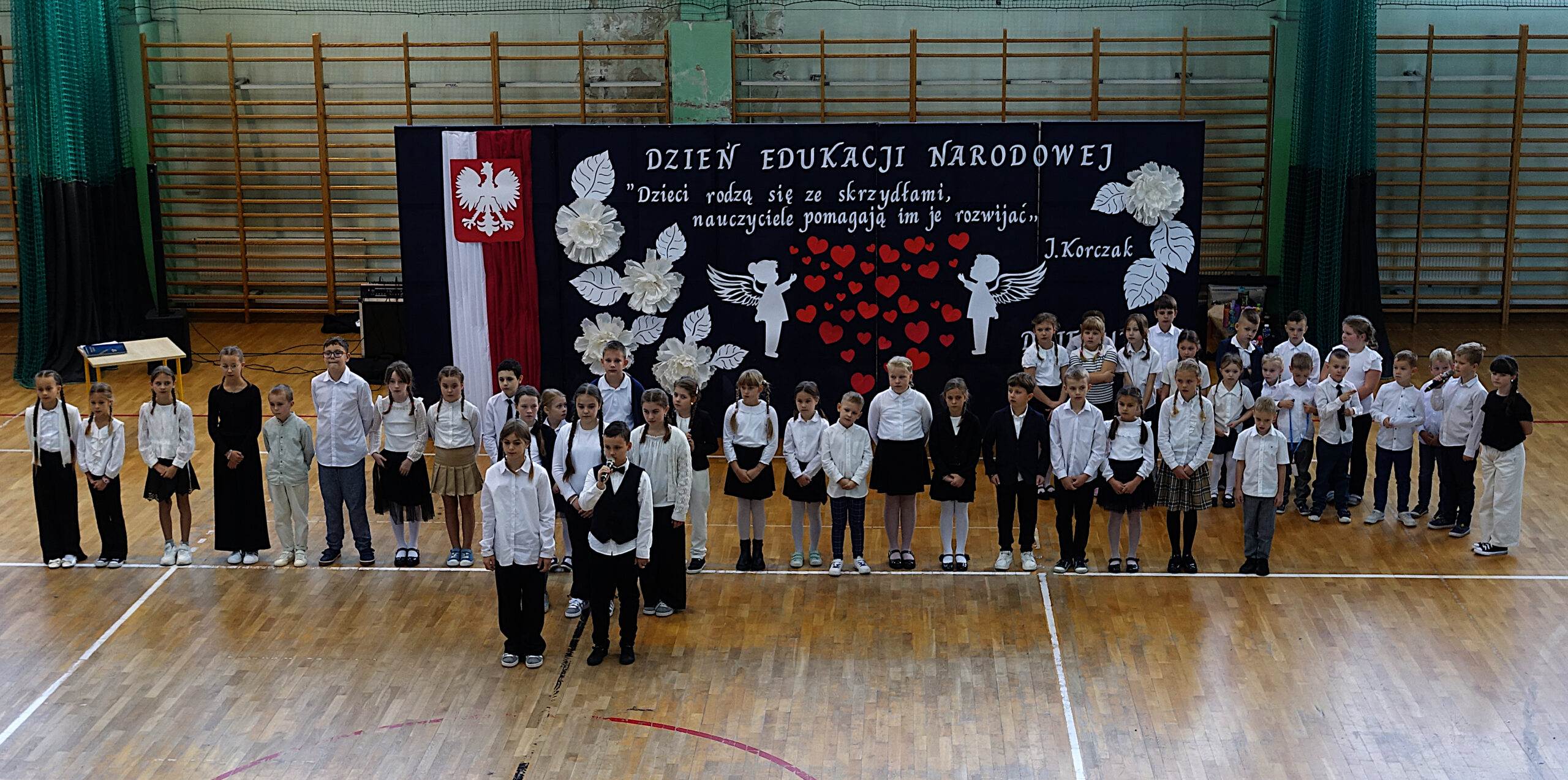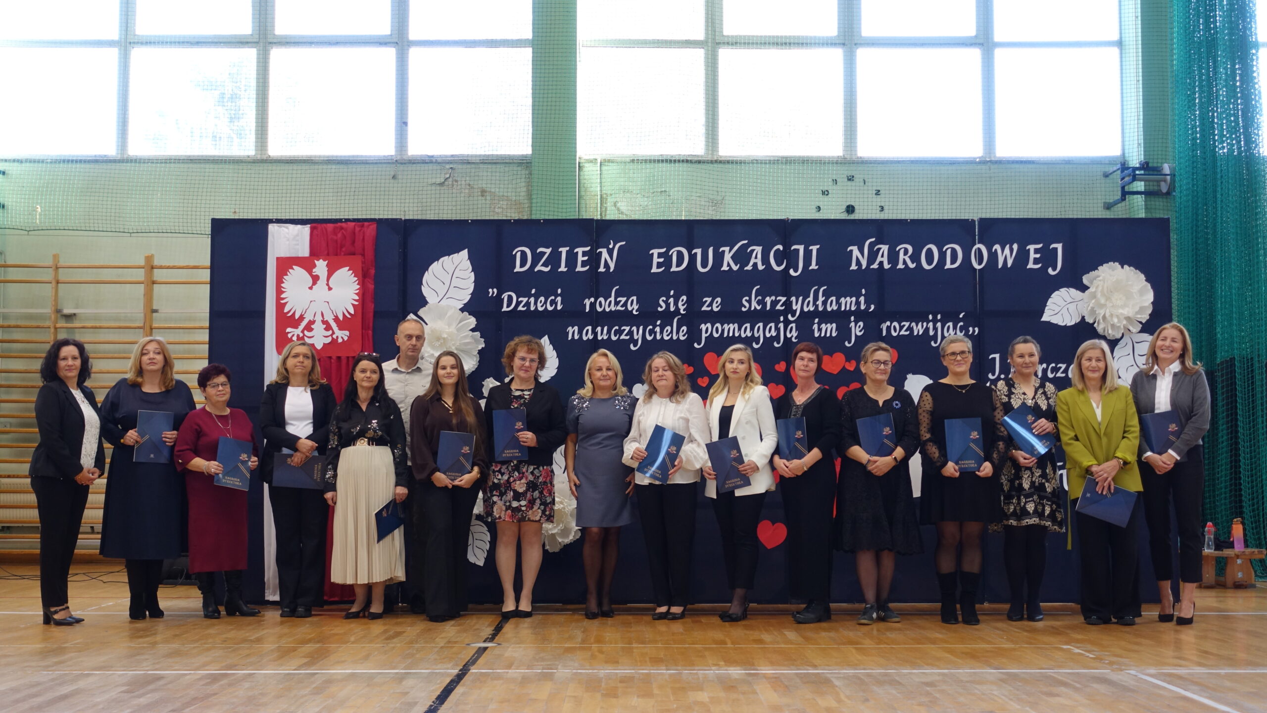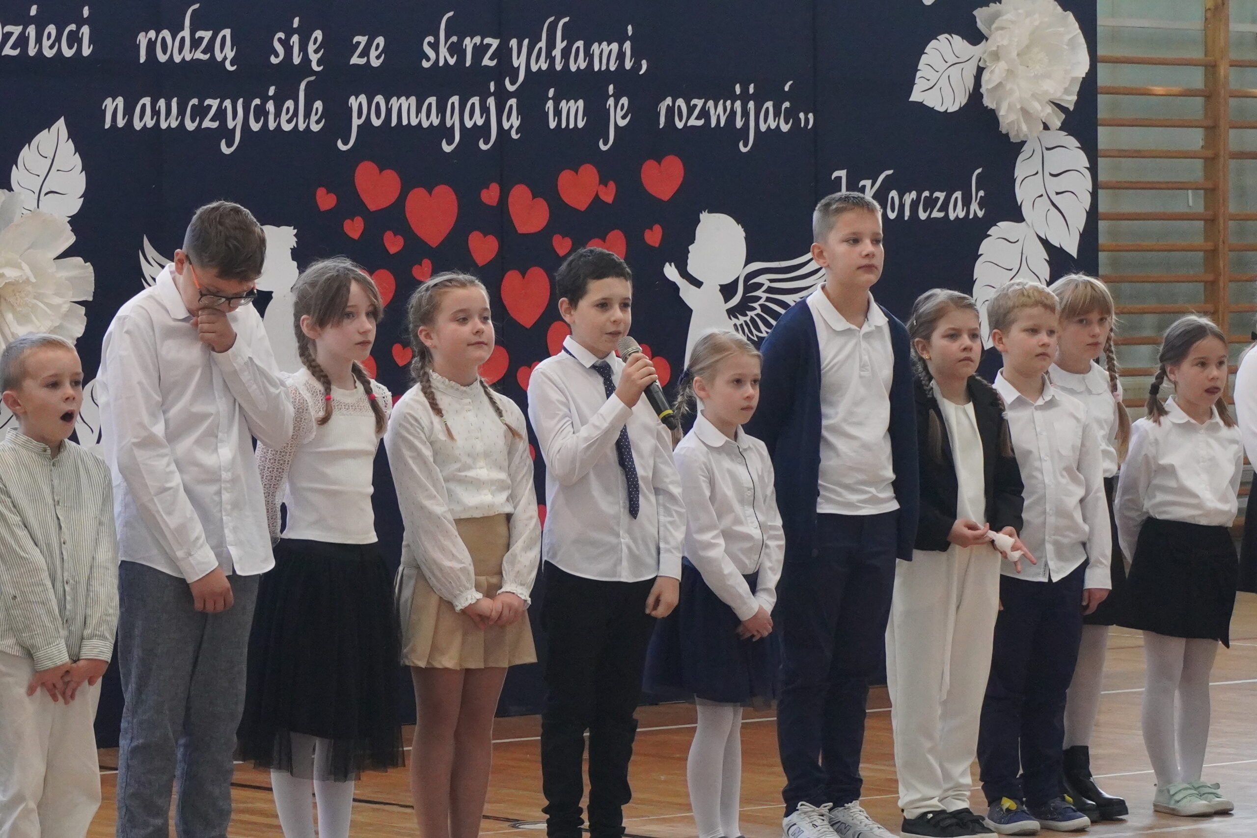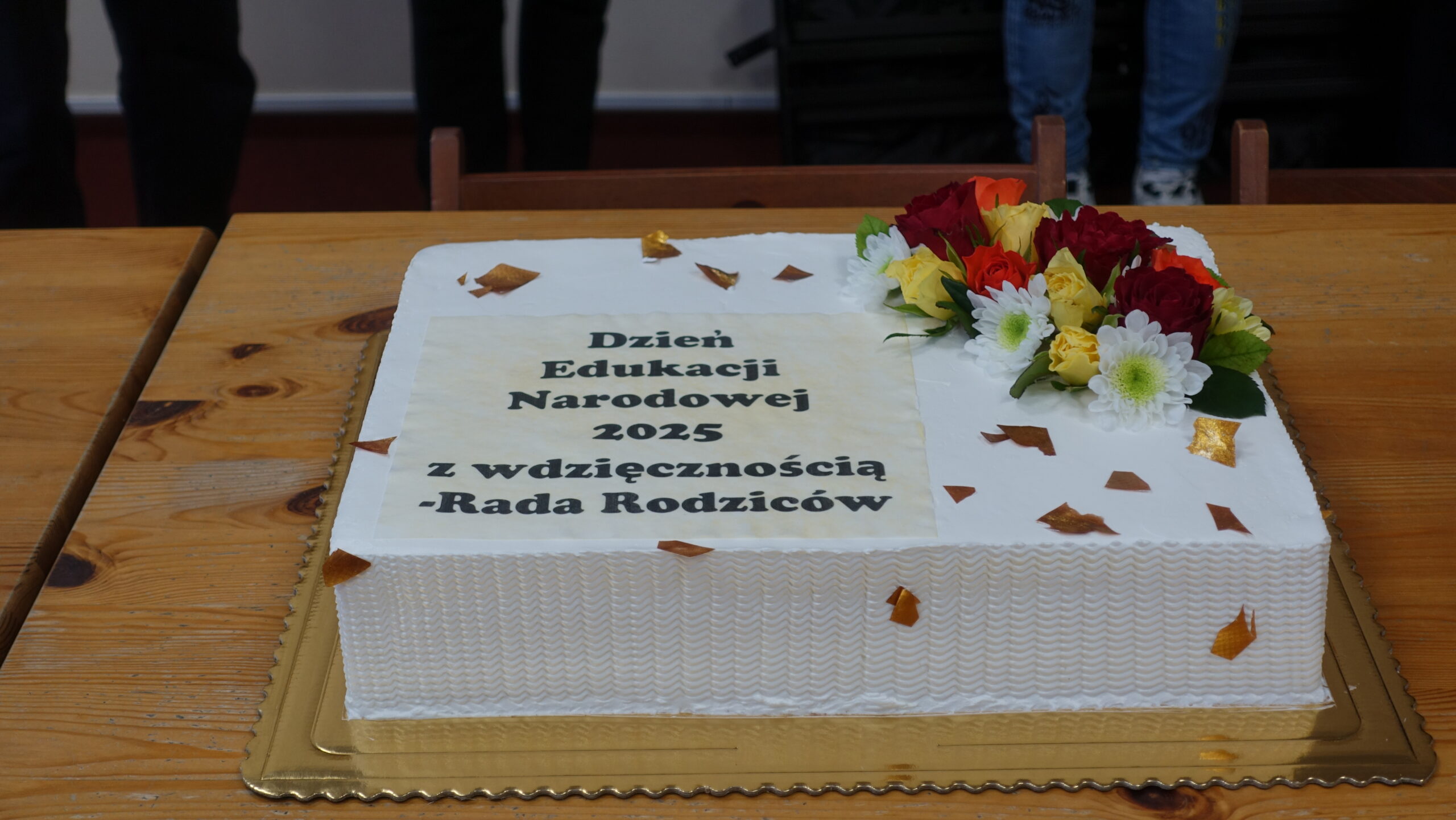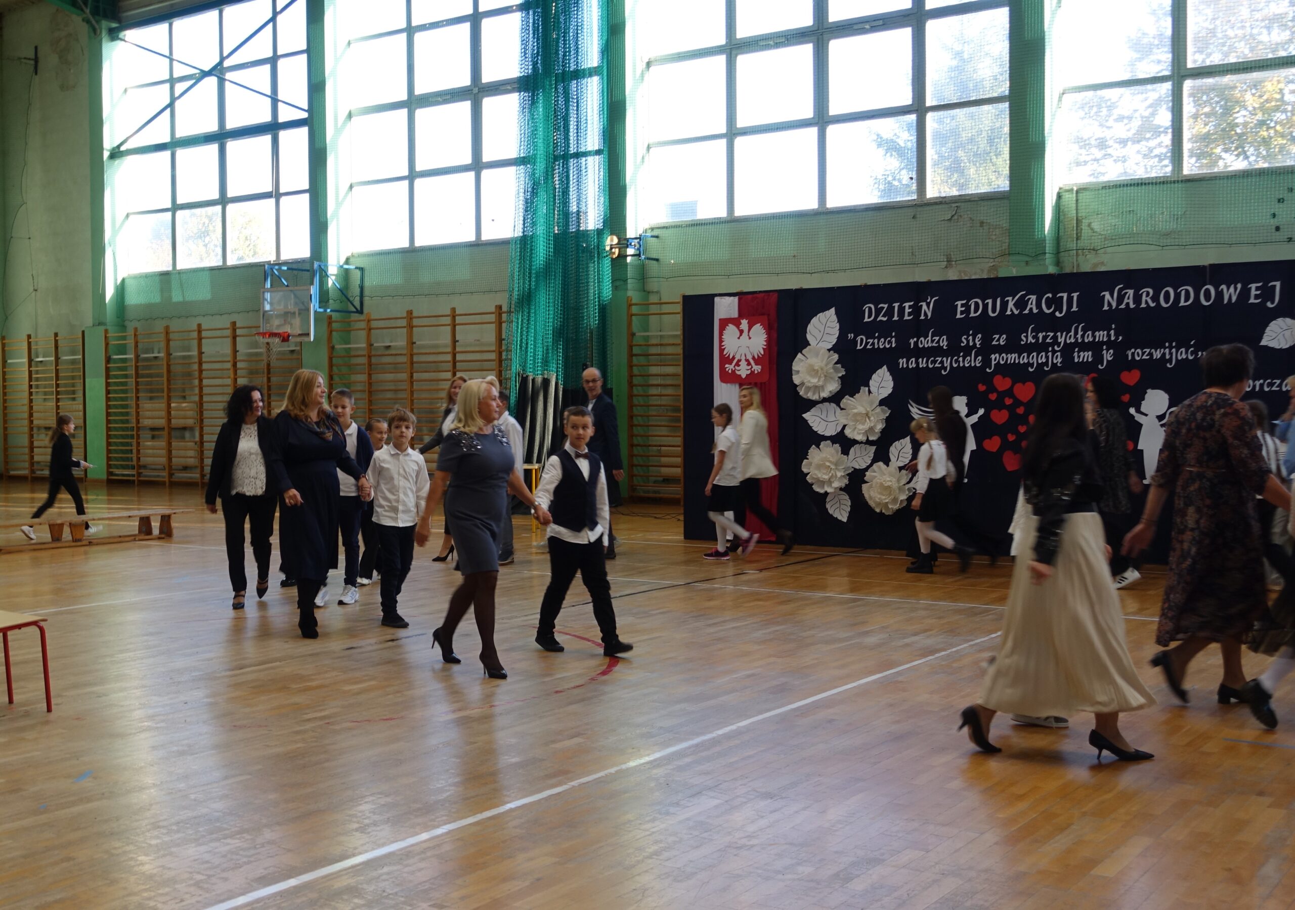 14 października 2025 roku w naszej szkole odbyły się obchody Dnia Edukacji Narodowej. Uroczystość rozpoczęła się od przemówienia pani dyrektor Małgorzaty Wyszyńskiej, w którym podkreśliła rolę nauczyciela w kształtowaniu młodych pokoleń oraz podziękowała za codzienny trud wszystkim pracownikom szkoły. Uczniowie pod kierunkiem wychowawców klas 1b, 2c, 3a i 5b przygotowali wyjątkowy montaż słowno-muzyczny. Podczas uroczystości zatańczyli belgijkę a następnie poprosili do tańca dyrekcję szkoły oraz nauczycieli. Układ taneczny został entuzjastycznie przyjęty przez publiczność. Uczniowie z Samorządu Uczniowskiego wręczyli symboliczne upominki pracownikom szkoły. Ważnym punktem uroczystości było wręczenie nagród dyrektora dla wyróżniających się nauczycieli oraz pracowników szkoły, w uznaniu za ich zaangażowanie i osiągnięcia. Uroczystość zakończyła się degustacją tortu ufundowanego przez Radę Rodziców.