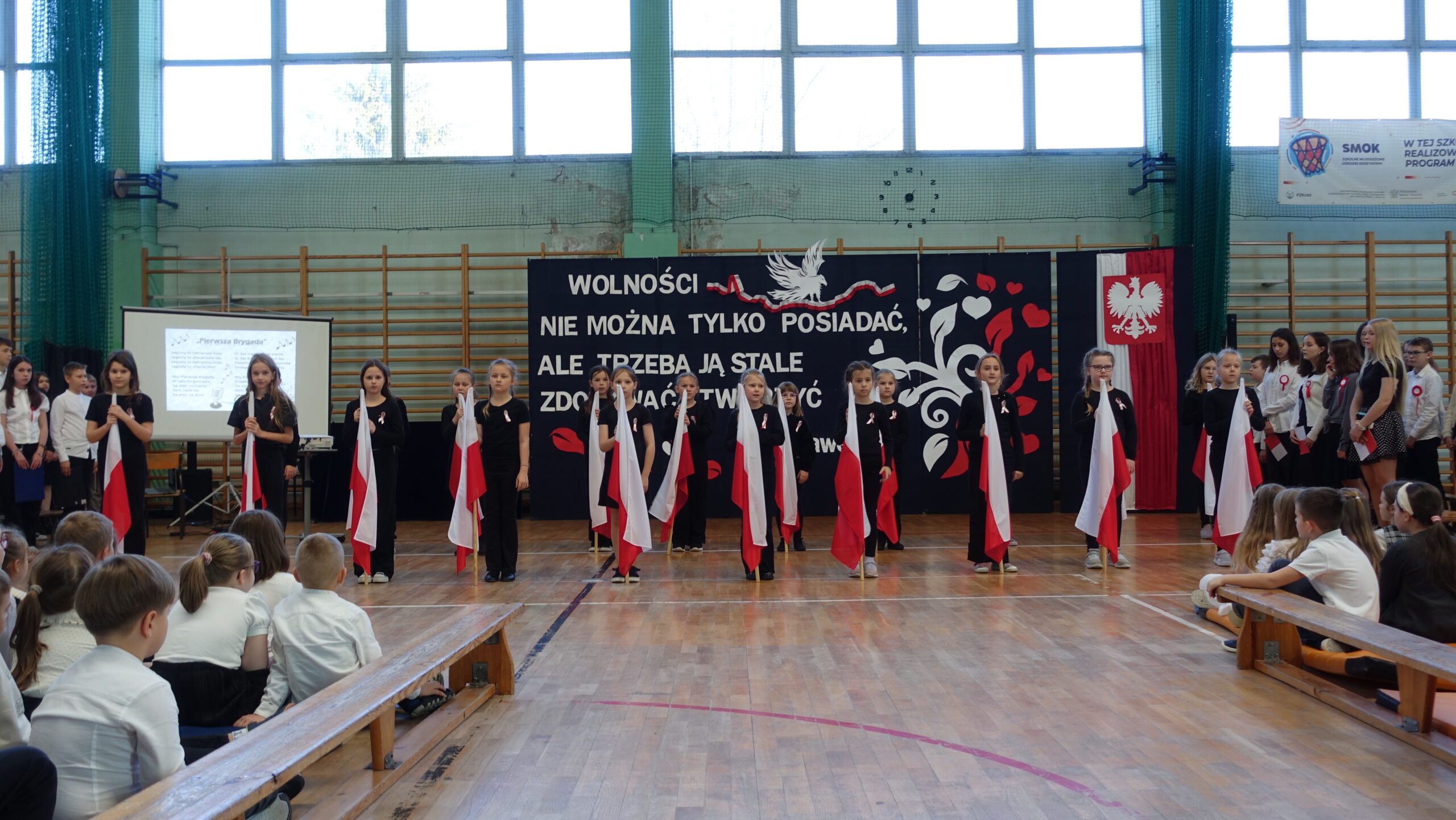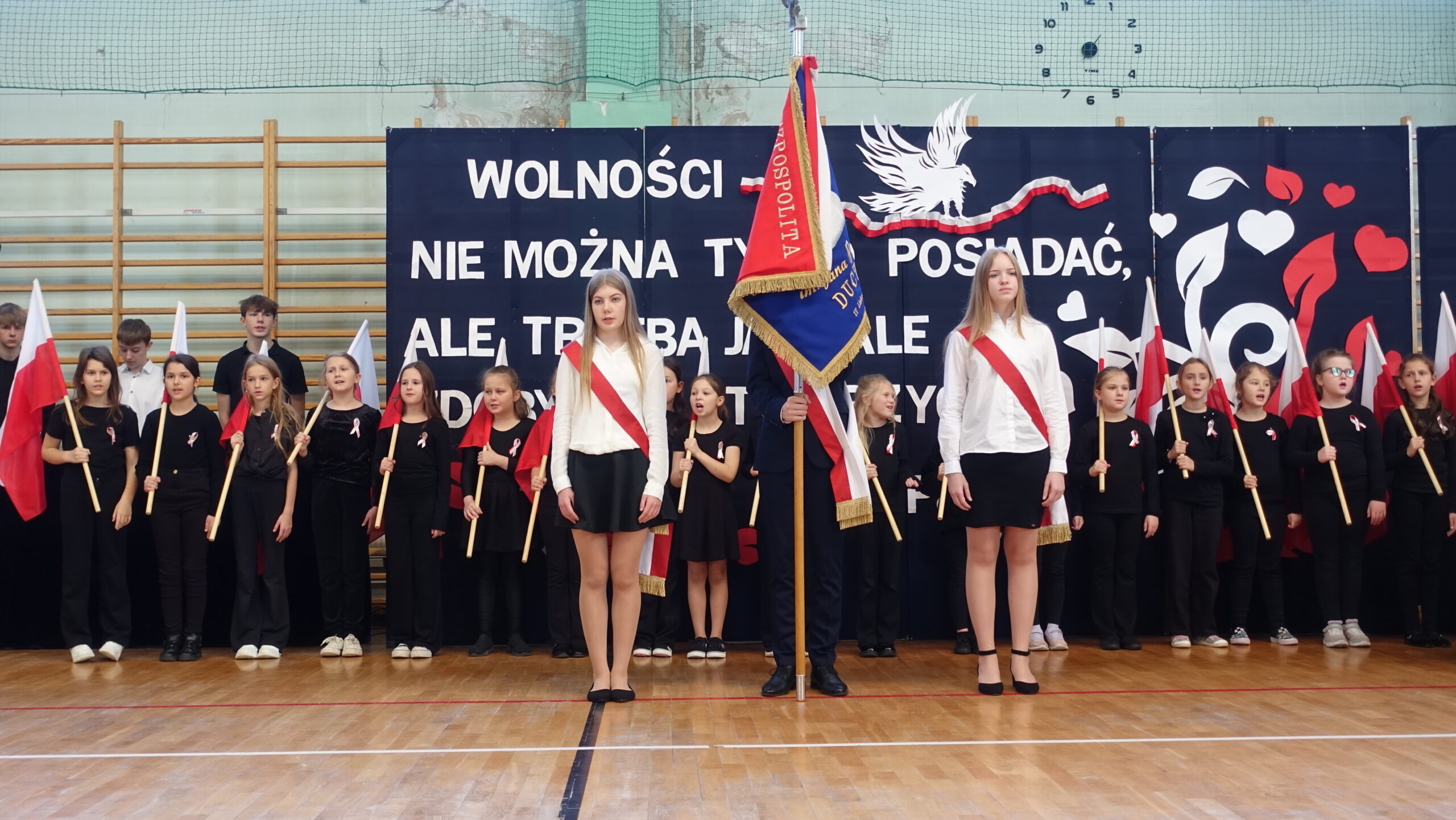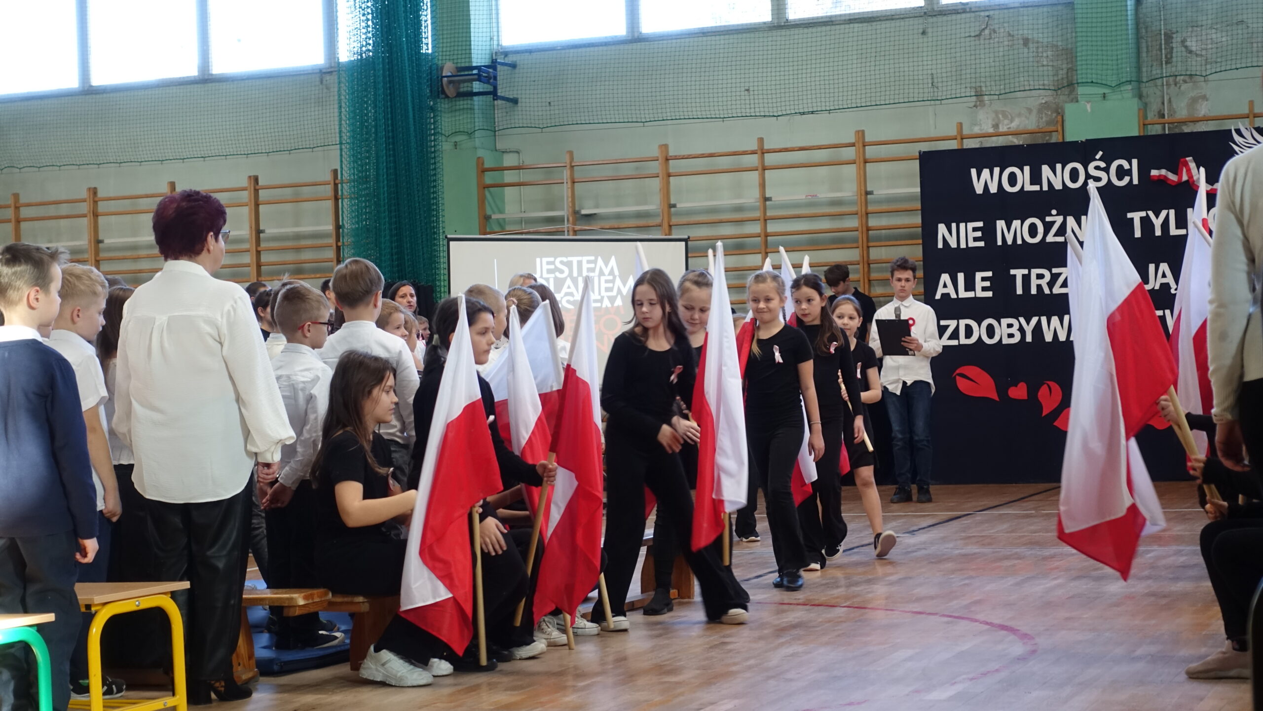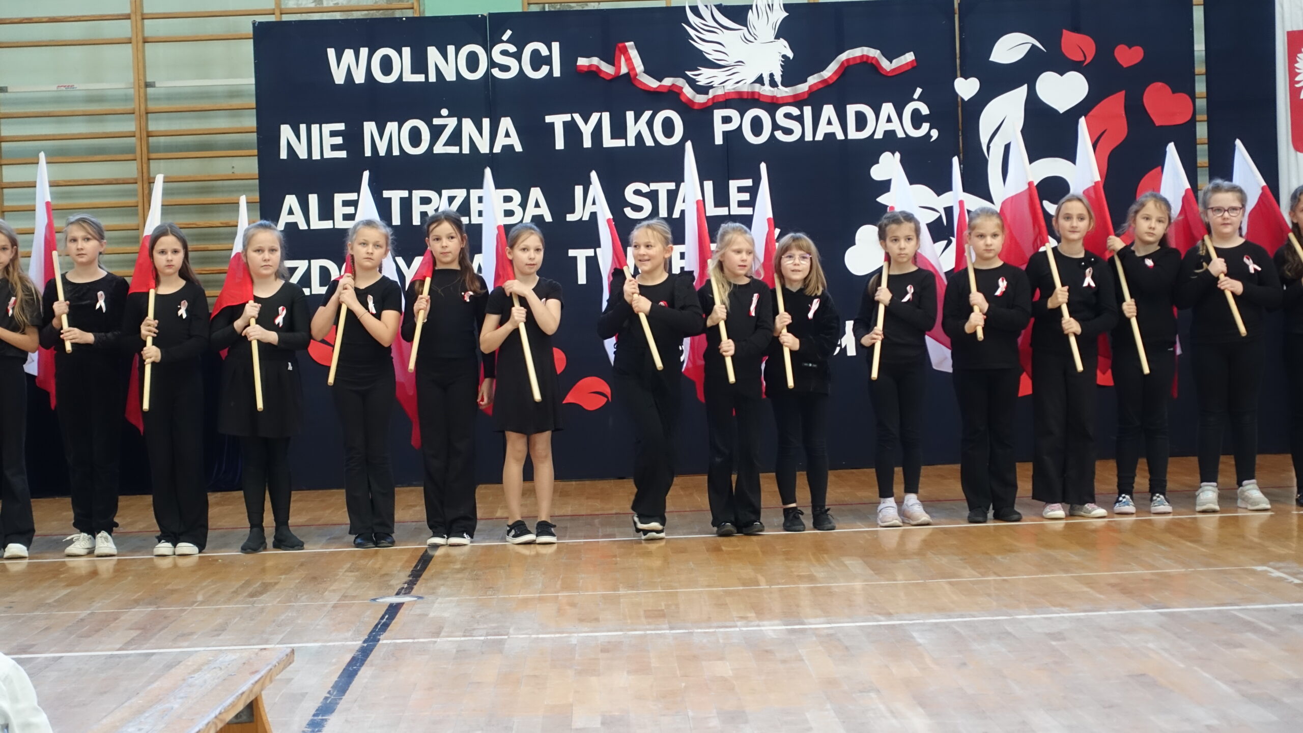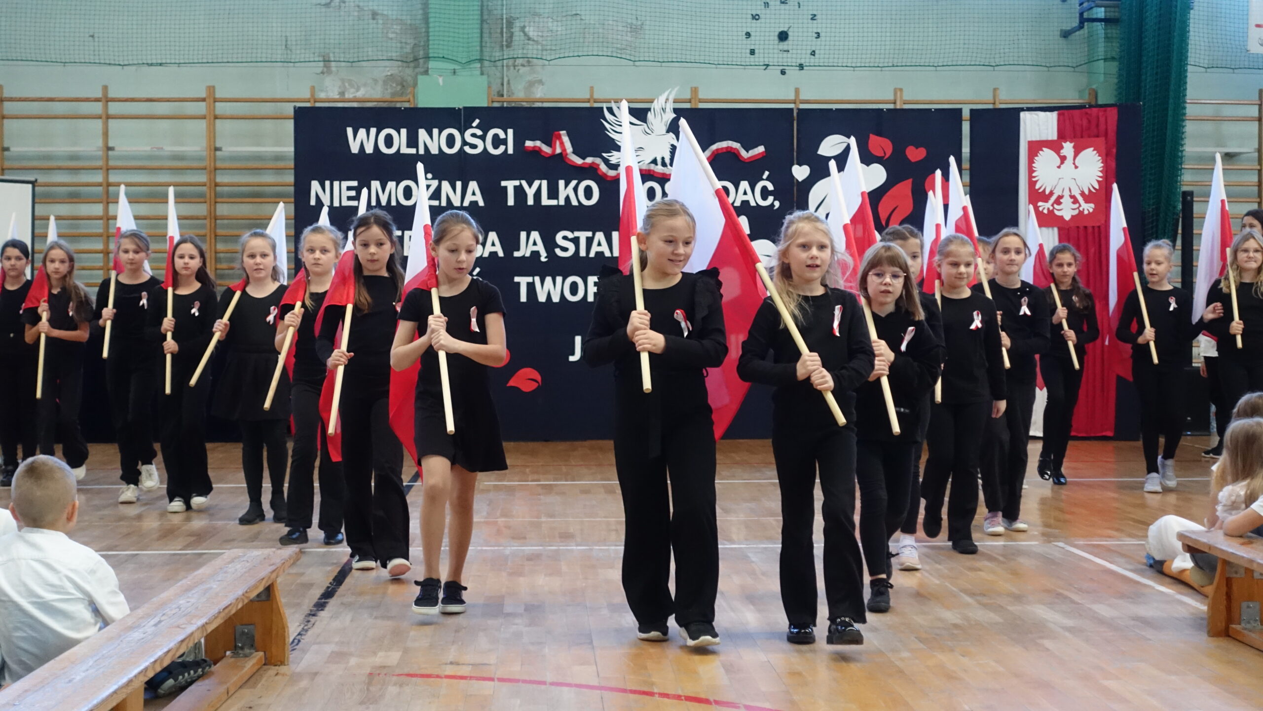 Dnia 10 listopada w naszej szkole odbyła się uroczystość upamiętniająca 107. rocznicę odzyskania przez Polskę niepodległości, która zgromadziła całą społeczność szkolną i przedszkolną, nauczycieli oraz uczniów. Następnie uczniowie klasy 7b z wychowawcą p. Ewą Przybylską oraz klasy 6b z wychowawcą p. Agnieszką Fudalej zaprezentowali montaż słowno-muzyczny, w którym przypomnieli najważniejsze wydarzenia z historii walk o wolność Ojczyzny, wzbogacając występ recytacjami, śpiewem oraz elementami inscenizacji, które pozwoliły lepiej zrozumieć trudną drogę Polaków do niepodległości. Ważnym momentem był taniec uczniów kl. 2a i 3b z białoczerwonymi flagami, które poruszały się w rytm podniosłej pieśni My, Pierwsza Brygada, tworząc piękne układy choreograficzne symbolizujące jedność i wolność. Uroczystość zakończyło wspólne odśpiewanie hymnu narodowego w ramach ogólnopolskiej akcji Szkoła do hymnu. Wydarzenie przebiegło w podniosłej i wzruszającej atmosferze, sprzyjającej refleksji nad historią Polski, dumie z narodowej tożsamości oraz wdzięczności wobec tych, którzy poświęcili swoje życie dla wolności.
